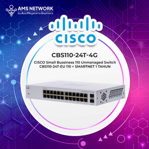 Cisco CBS110-24T-EU adalah switch non-terkelola (unmanaged) yang dirancang untuk jaringan usaha kecil yang membutuhkan konektivitas yang andal tanpa memerlukan konfigurasi yang kompleks. Cisco Business 110 Series umumnya dilengkapi dengan Garansi Hardware Seumur Hidup Terbatas (Limited Lifetime Hardware Warranty) dari Cisco. Di beberapa lokasi/penjual, produk ini juga bisa disertakan dengan 1 tahun lisensi layanan dukungan seperti SmartNet Total Care (SNTC).